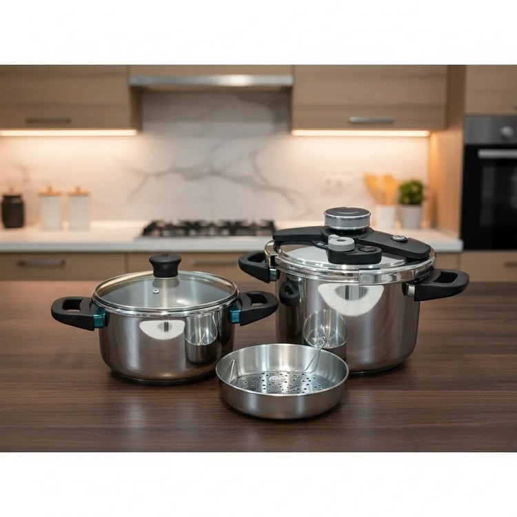 دو درب مجزا (درب زودپز با قفل ایمن و سوپاپهای ایمنی و درب شیشهای مقاوم در برابر حرارت) به همراه سبد بخارپز استیل، این محصول را برای آشپزی خانگی و حرفهای ایدهآل میکند. با این زودپز میتوانید غذاهای سالم، مغذی و خوشطعم را در کمترین زمان آماده کنید.